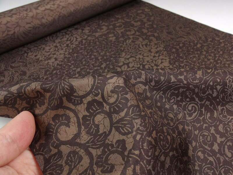 唐草や植物を裂取りに染め上げられたおちついた柄行きです。