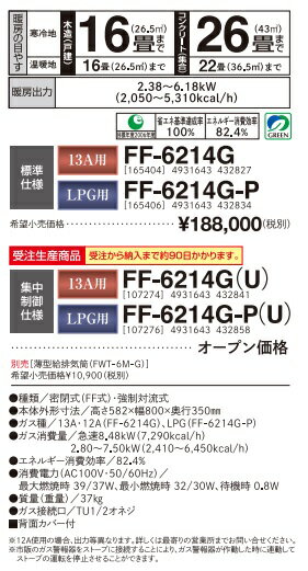 カテゴリ:ガス暖房機 暖房 ガスストーブ メーカー:サンポット SUNPOT 型番:FF-6214G-P(U) / FF-6214G-P-U / FF6214GPU 延長保証にご加入の場合は、ご注文前に必ずこちらをご確認下さい。