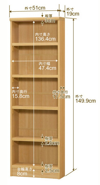 サイズ奥行19cm×高さ149.9cm×幅51cm側板(内寸)16.2cm側板(外寸)17.5cm有効内寸幅外寸幅−(マイナス)3.6cm材 質プリント紙化粧繊維板塗 装ウレタン樹脂塗装棚 板棚 板耐荷重左の耐荷重基準値表を参照棚 板奥行15.8cm奥行19cm×高さ149.9cm×幅51cm