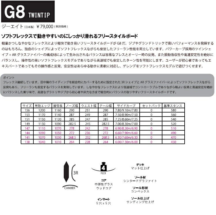 ソフトフレックスなのでバタートリックや地形でのスタイルの出しやすさはダントツ! またパークも文句なしの板さばきが可能な一本! 低速でのアプローチから高速域でのトリックのきっかけ作りは容易にできるG8!----------------------------------------------------- --------------------------------------- *TWP(トゥルーワクサープロ)ワックスチューンを同時ご注文にて(5500円 税込み)にて施します!シーズン中のワックスの手入れの際の浸透率が違います!同時ご購入限定価格ですのでこの機会に是非!--------------------------------------- オガサカストラクチャー加工(斜めクロス*浅め)をオガサカ工場にて生産ライン時に加工することが可能です!通常13200円をなんとABEAMでご注文時に同時に追加いただくと6600円(税込み)にて加工が受けられます!精密に計算されたオガサカ独自のコンベックス加工ボードには、オガサカ工場のストラクチャーマシーンでの加工をお勧めいたします。